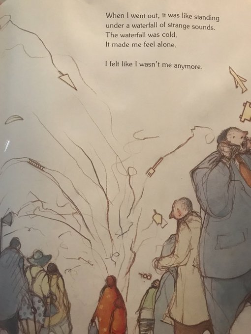 Something I noticed while reading was that the main character and her aunt are colored bright orange. The backgrounds in the book are light, duller colors, resulting in an obvious contrast. I think Freya Blackwood did this to symbolize how the character felt when she was out in public. Maybe she felt like she stuck out or that she didn’t fit in or belong with the crowd.