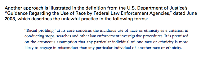 Below is a picture of an excerpt from a leadership guide for police officers. It addresses racial profiling and how a race or ethnicity should not determine whether or not a cop performs/follows certain procedures.